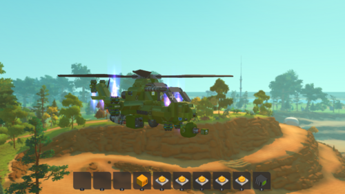 Это мой шедевр в виде крутого очень управляемого вертолёта с стабилизацией на баге и на PID логике. AWSD - Управление. Правая кнопка мыши - крен в право, левая кнопка мыши - крен в лево. Он вооружен двумя ракетами (кнопка 5) и управляемой пушкой (пробел), управление пушкой - кнопки 6, 7, 8, 9. Включение камеры пушки кнопка 0. Кнопка 1 - увеличить высоту на 10 блоков, кнопка 3 - увеличить высоту на 100 блоков. Все изменения высоты суммируются. Белая кнопка - обнуление высоты. Кнопка 4 - быстрое снижение.