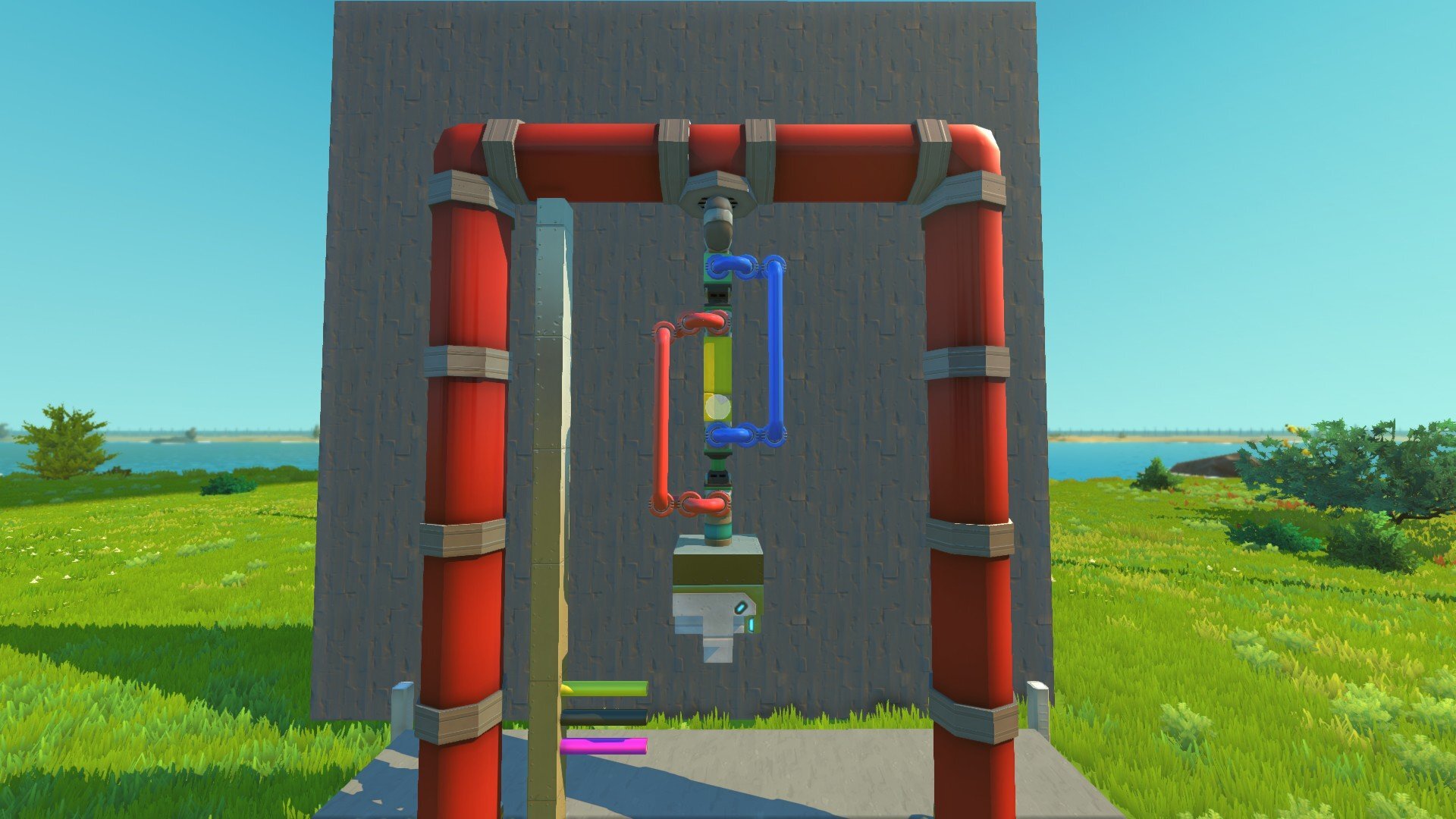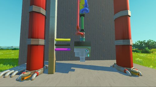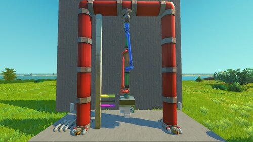 Используется две пружины в виде поршней (они зелёные на скрине), которые жёстко присоединены друг к другу промежутком из блоков и, чтобы лучше растягивались, настроены с помощью The Modpack. На них висит груз, который растягивает поршни. Также ещё есть две «верёвки», которые в изначальном состоянии остаются ненатянутыми (расслабленными). Синяя связывает начало нижнего поршня с верхним крепежом, а красная — груз с концом верхнего поршня (на скрине всё наглядно видно).