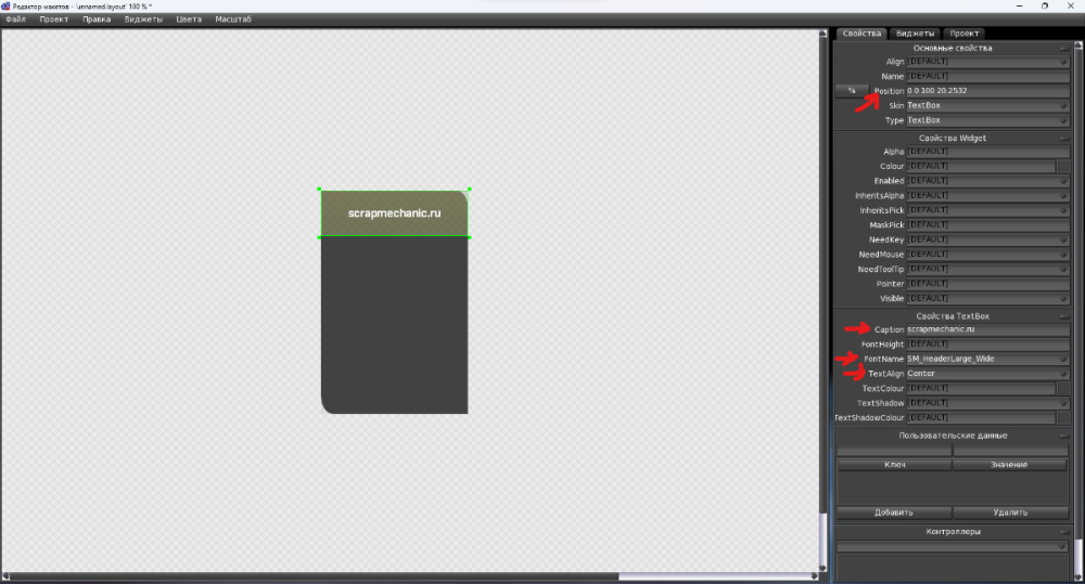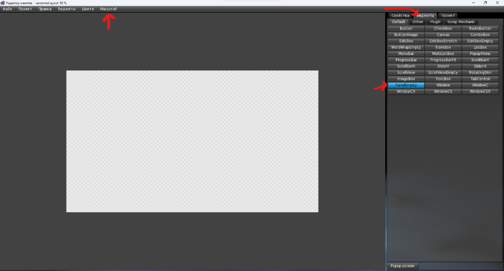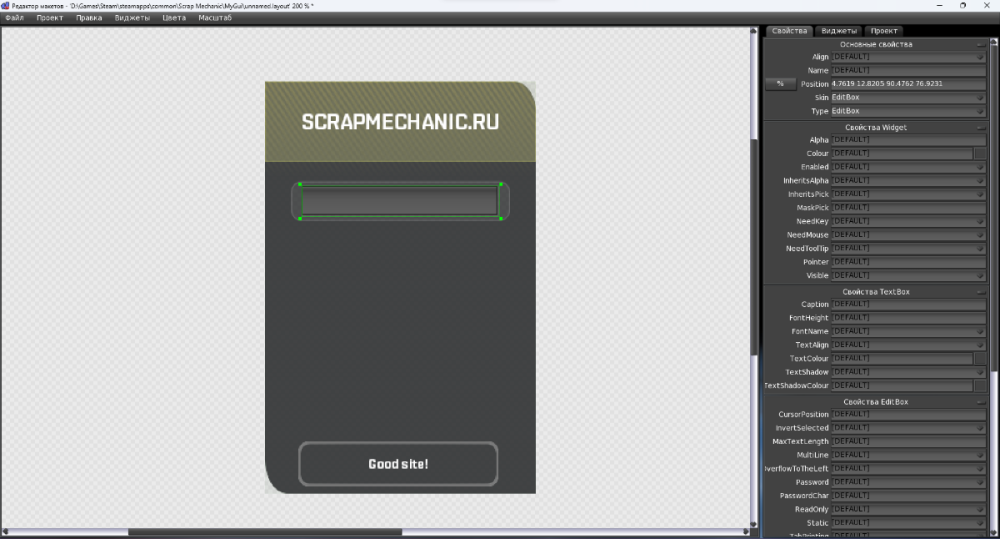Введение Всем привет! Начну с самого начала, создание модов - очень сложный процесс, требующий хотя бы базовых знаний языка программирование Lua. Рекомендую для начала ознакомится с самим Lua. После прочтения руководства, можно и начать создавать интерфейсы. Почему именно интерфейсы? Потому что по ним очень мало уроков, тем более в русскоязычном сообществе, а с этим гайдом любой сможет делать интерфейсы! Основная часть Scrap Mechanic - гениальная игра, использующая для отрисовки интерфейса готовую библиотеку MyGui, её мы и будем изучать. MyGui схож с html, у них у обоих есть теги, но в MyGui вы можете использовать всего лишь 2 - Widget и главный тег MyGUI. Вы спросите: "Так если в MyGui всего 2 тега, то как различать элементы управления, раз нет ни button, ни input и так далее?", а я вам отвечу, что у каждого Widget обязательно должен быть атрибут type! Именно в нём, как следует из названия, содержится тип виджета. Существуют следующие типы виджетов: Button - кнопка EditBox - поле для ввода текста ImageBox - картинки TextBox - текст Widget - пока назовём "Задний фон" StrangeButton - весёлая кнопка Это не весь список типов, а лишь те, с которыми мы можем взаимодействовать из кода. (Интерактивные элементы не названные тут не работают в Scrap Mechanic, например ComboBox, для него банально нет функций) Так, с типами разобрались. Что дальше? А дальше скины! Нет, не скины с cs:go, а скины на эти самые виджеты. Их очень много и каждый для своих элементов, все скины вы сможете увидеть сами чуть позже. Я лишь объясню как это работает. Представьте, что каждый виджет это картинка, и это картинку мы можем менять, так скины и работают, они меняют внешний вид виджета. Практика? Да, настало время практики! У нас есть 2 путя - мазохизм и ленивый. Первый путь называется так не с проста, это в прямом смысле слова мазохизм, это ручное изменение файлика с интерфейсом. Второй же более приятный - редактирование через специальную программу Layout Editor (Редактор макетов). Первый путь не будет затронут в данном гайде, а начнём мы со второго. В официальном Discord сервере Scrap Mechanic, в канале modding-general, в закреплённых сообщениях есть уже настроенный редактор макетов. Им мы и будем пользоваться, всё подчёркнутое раннее кликабельно и ведёт на сервер Scrap Mechanic. Скачиваем этот редактор, распаковываем желательно рядом с Scrap Mechanic, так как я вам советую подсматривать оригинальные интерфейсы, это не плохо, а наоборот даёт вам больше знаний. После распаковки открывайте LayoutEditor.exe, не пугайтесь, никаких вирусов там нет. При первом запуске вас встретит окно конфигурации, в поле Rendering Subsystem выбирайте Direct3D и нажмите OK, программа может подвиснуть. После нажатия OK вас встретит сам интерфейс программы! Возможно он покажется вам сложным, но это только на первый взгляд, на деле всё просто. Рекомендую увеличить размер правой панели, а также изменить масштаб (кнопка сверху) на 50%, также вы можете менять масштаб на колёсико и перемещать холст удержанием правой кнопкой мыши и её перемещением. Основой вашего окна должна стать PanelEmpty, для этого перейдите во вкладку виджета справа сверху (не сверху, а справа сверху!), и выберите там PanelEmpty. В окне с сеткой проведите прямоугольник нужного вам размера в любом месте, потом мы сделаем его по центру, а также после каждого создания элемента, перейдите на вкладку свойства и установите ему местоположение (Position, 4 цифры разделённые пробелом, 1 и 2 - это x и y соответствен